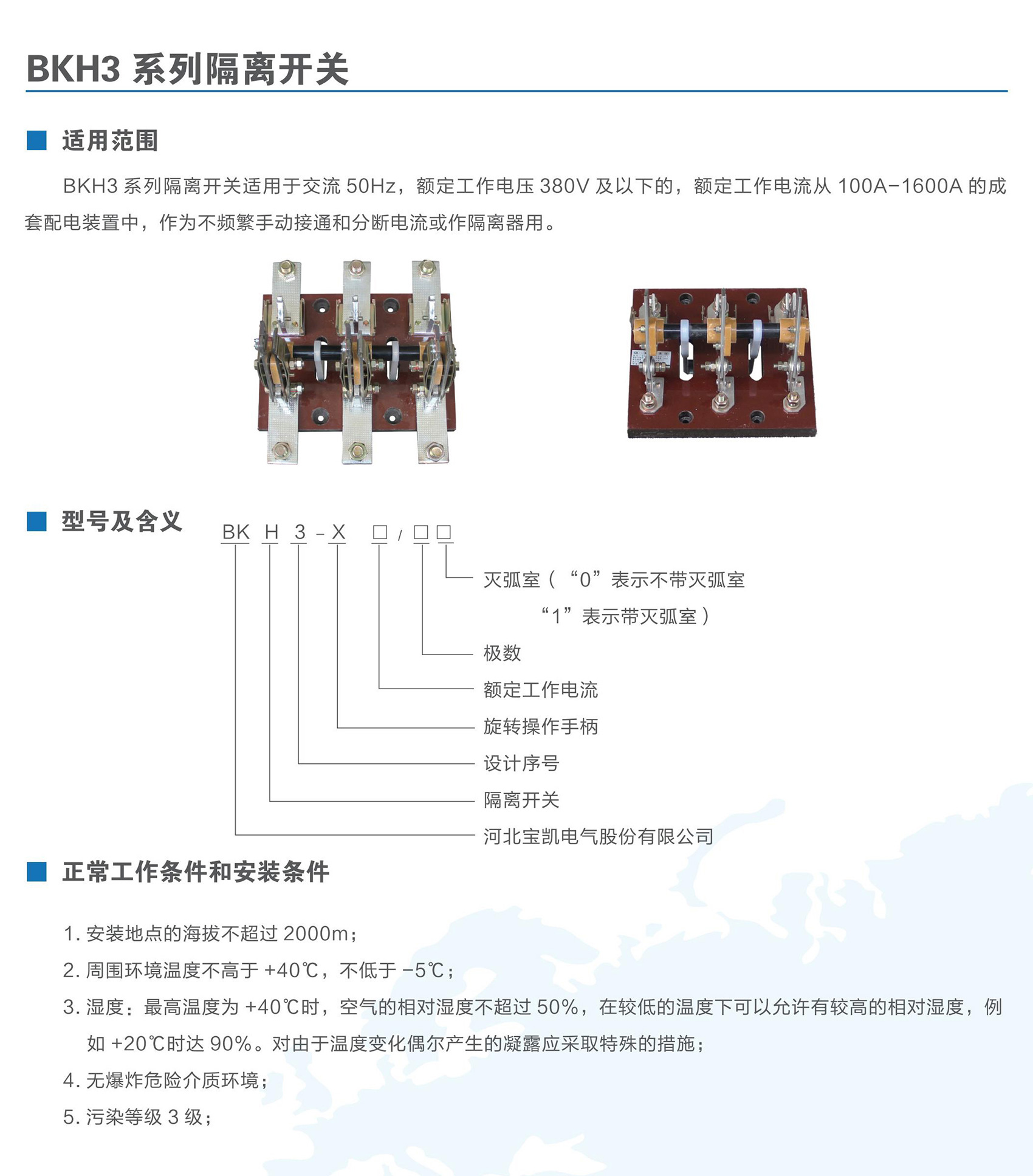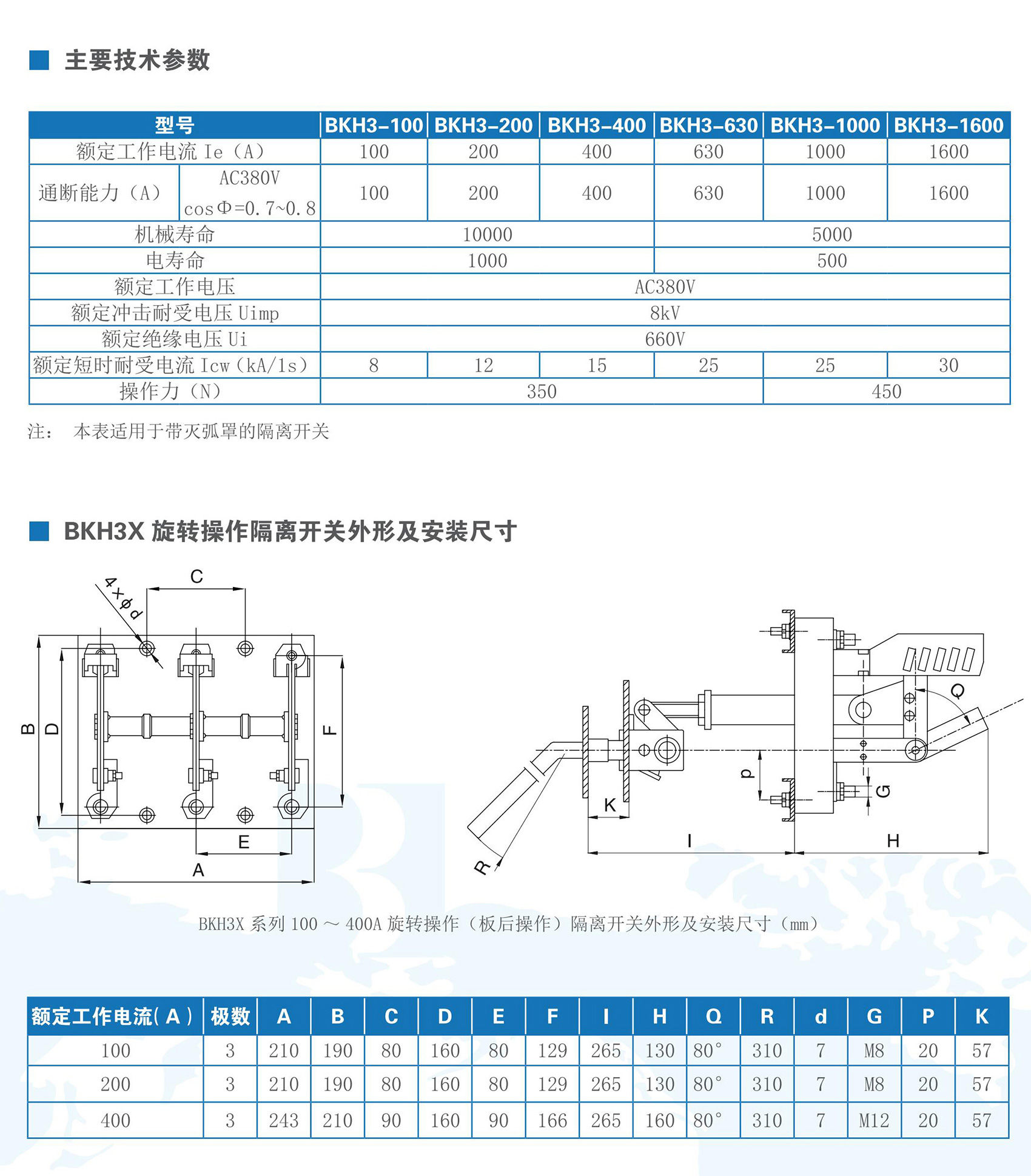 BKH3系列隔離開關(guān)適用于交流50Hz,額定工作電壓380V及以下,額定工作電流100A-1600A的成套配電裝置中,作為不頻繁手動接通和分?jǐn)嚯娏骰蜃鞲綦x器用。BKH3系列隔離開關(guān)符合GB/T 14048.3《低壓開關(guān)設(shè)備和控制設(shè)備低壓開關(guān)、隔離器、隔離開關(guān)及熔斷器組合電器》。