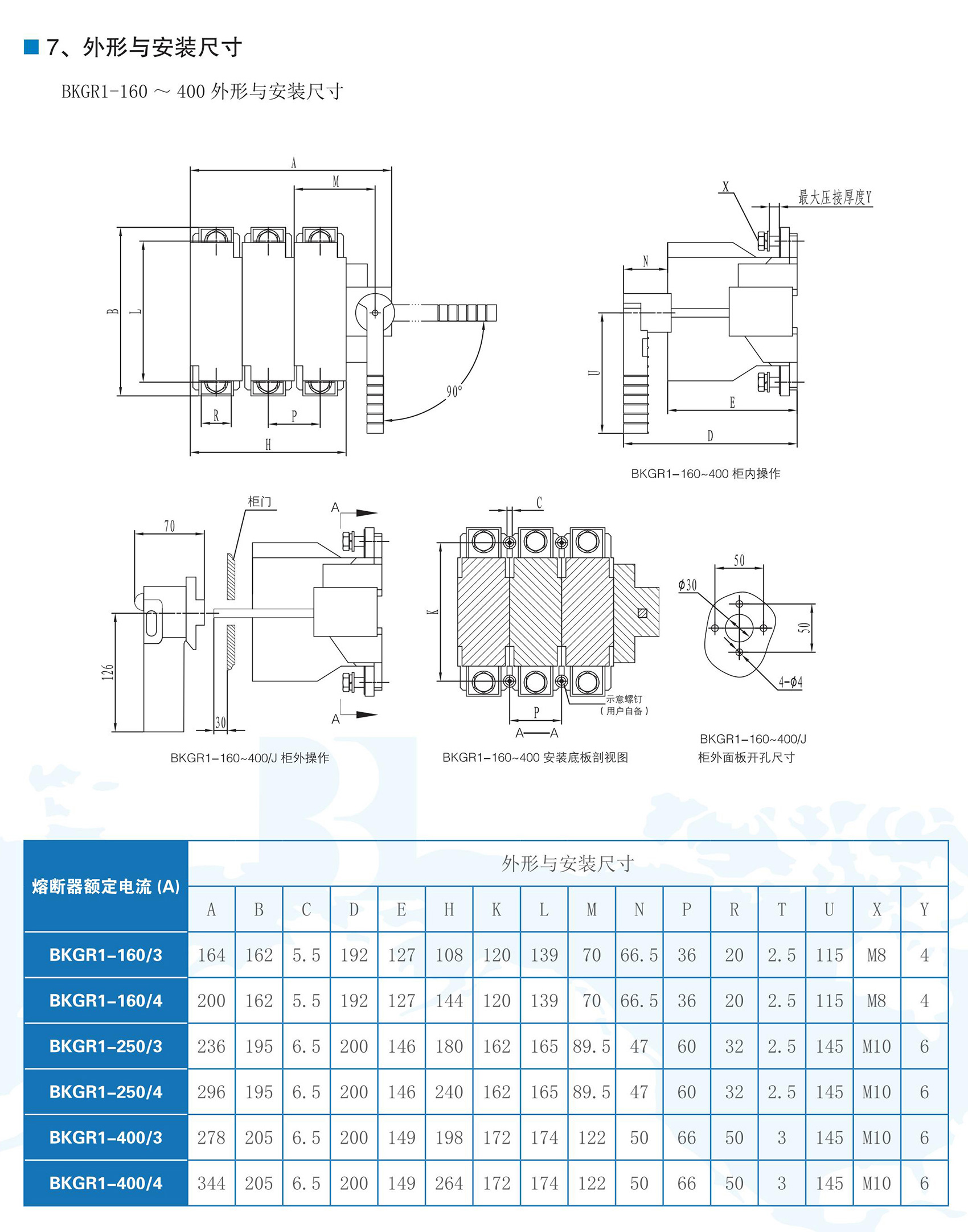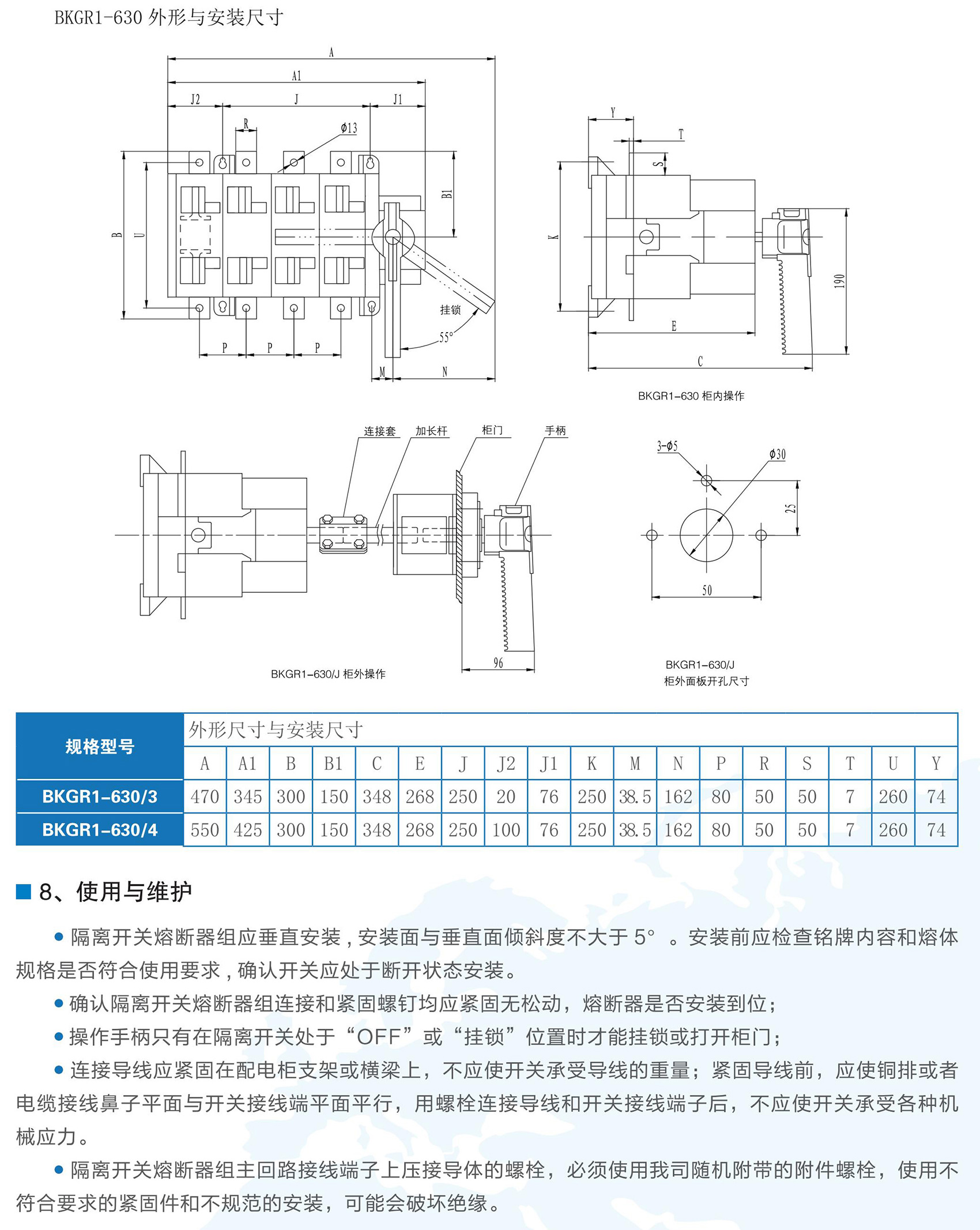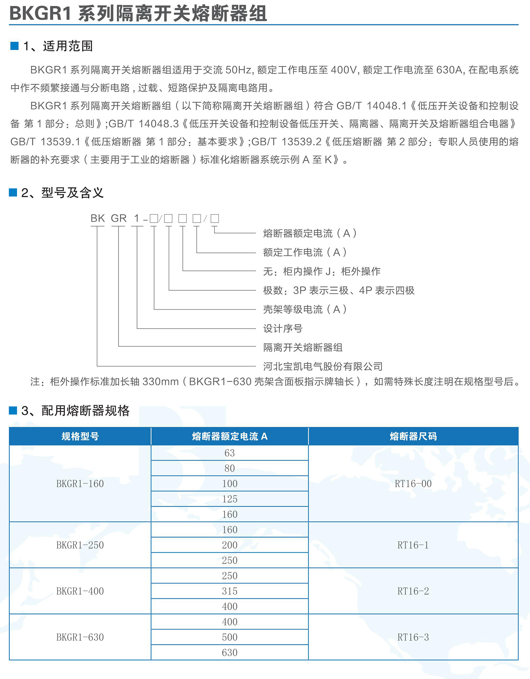 BKGR1系列隔離開關(guān)熔斷器組適用于交流50Hz,額定工作電壓為AC400V,額定工作電流63A-630A的低壓配電或電動(dòng)機(jī)網(wǎng)絡(luò)中,作為不頻繁接通、分?jǐn)嚯娐芳熬€路的隔離之用??商峁┒搪?、過載保護(hù)功能。BKGR1系列隔離開關(guān)熔斷器組符合GB/T 14048.3《低壓開關(guān)設(shè)備和控制設(shè)備低壓開關(guān)、隔離器、隔離開關(guān)及熔斷器組合電器》。