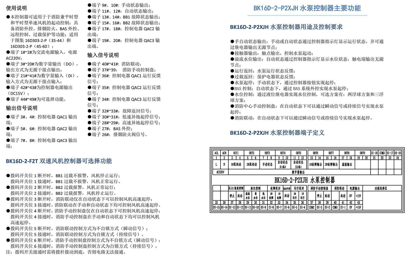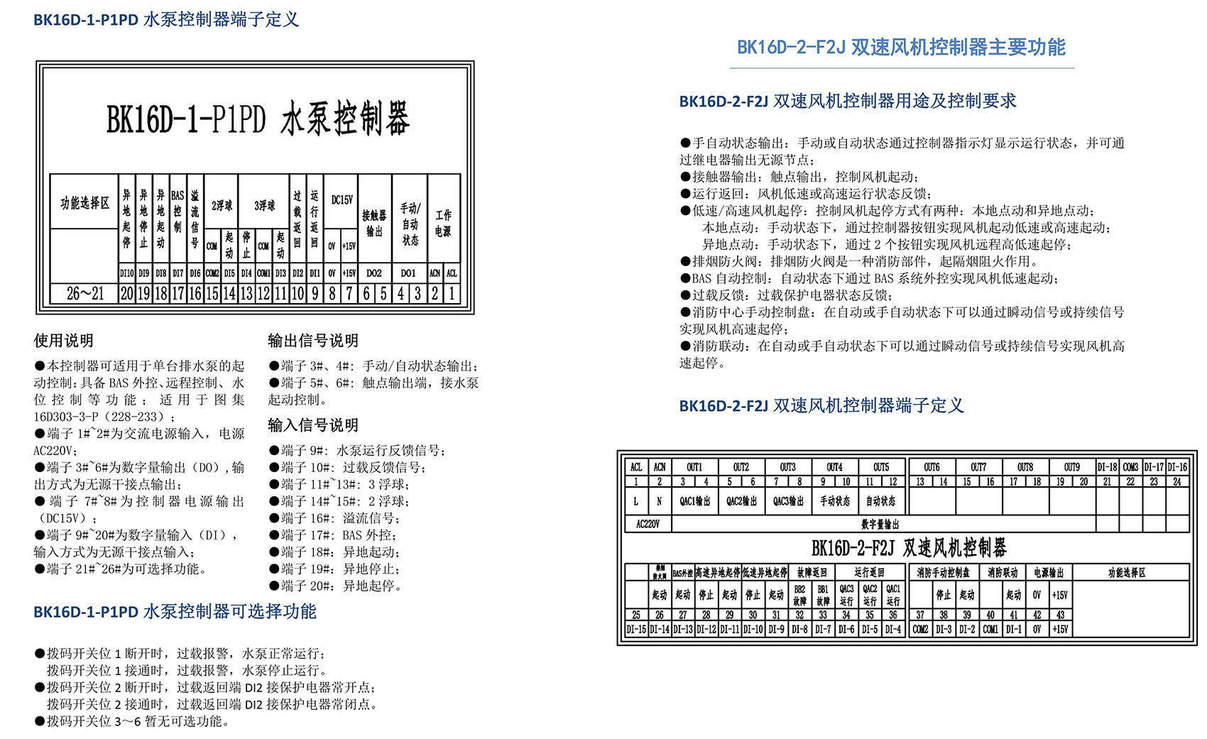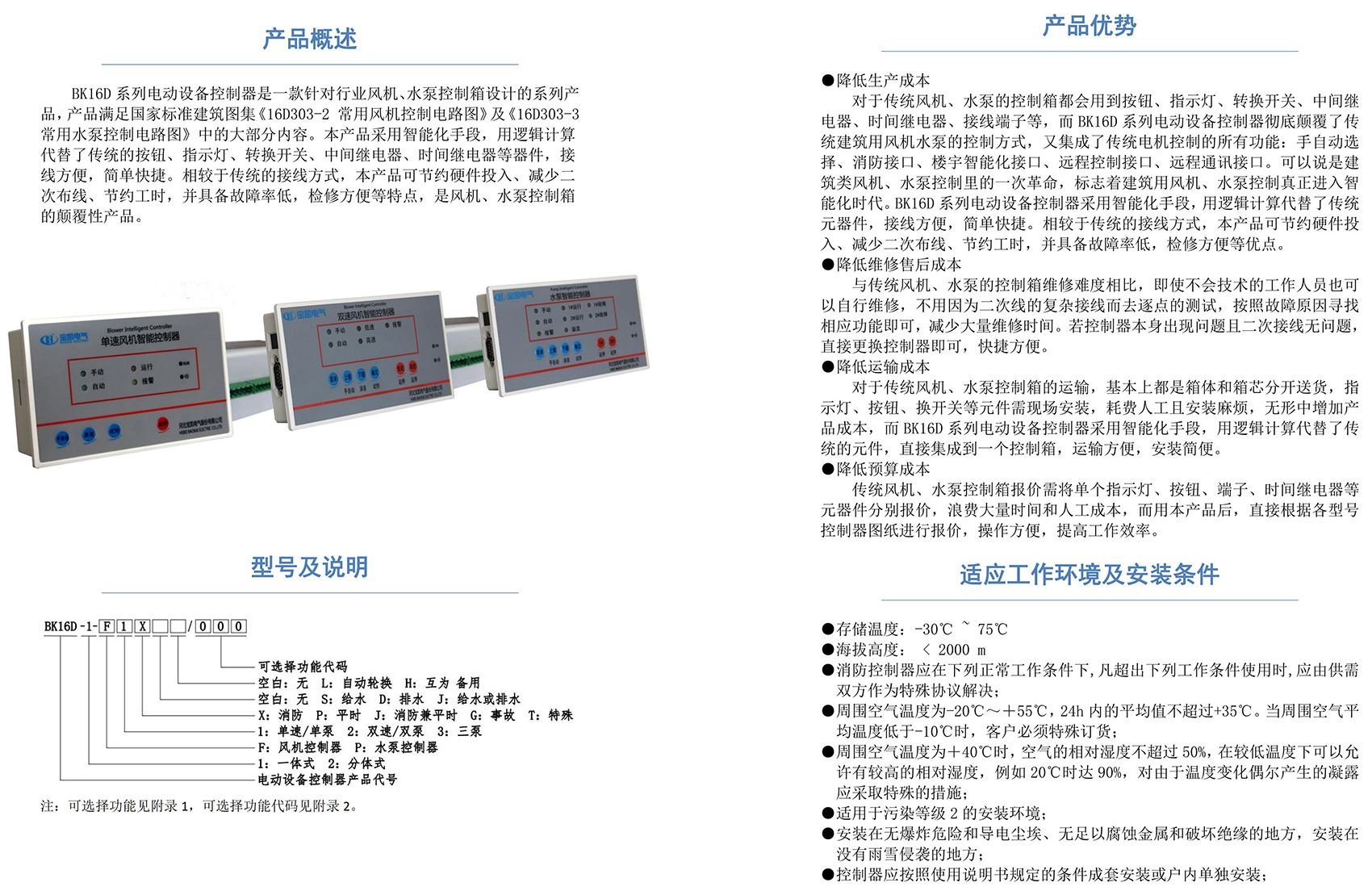 BK16D系列電動設(shè)備控制器是一款針對行業(yè)風(fēng)機(jī)水泵控制箱設(shè)計的系列產(chǎn)品,產(chǎn)品滿足國家建筑標(biāo)準(zhǔn)設(shè)計圖集《16D303-2 常用風(fēng)機(jī)控制電路圖》及《16D303-3 常用水泵控制電路圖》。本產(chǎn)品采用智能化手段,用邏輯計算代替了傳統(tǒng)的按鈕、指示燈、轉(zhuǎn)換開關(guān)、中間繼電器、時間繼電器等器件,接線方便,簡單快捷。相較于傳統(tǒng)的接線方式,本產(chǎn)品可節(jié)約硬件投入、減少二次布線、節(jié)約工時,并具備故障率低,檢修方便。
