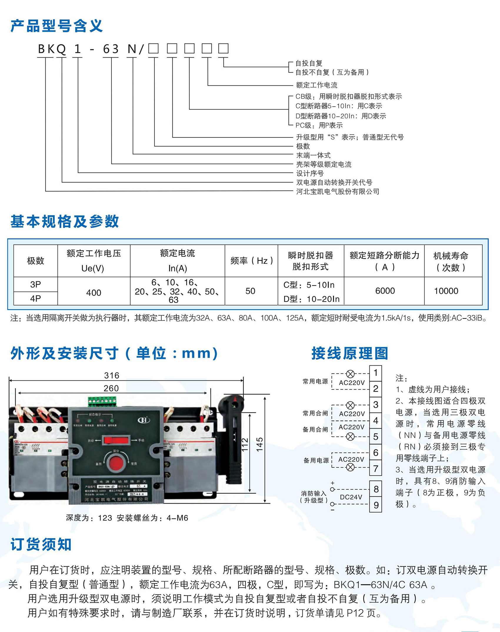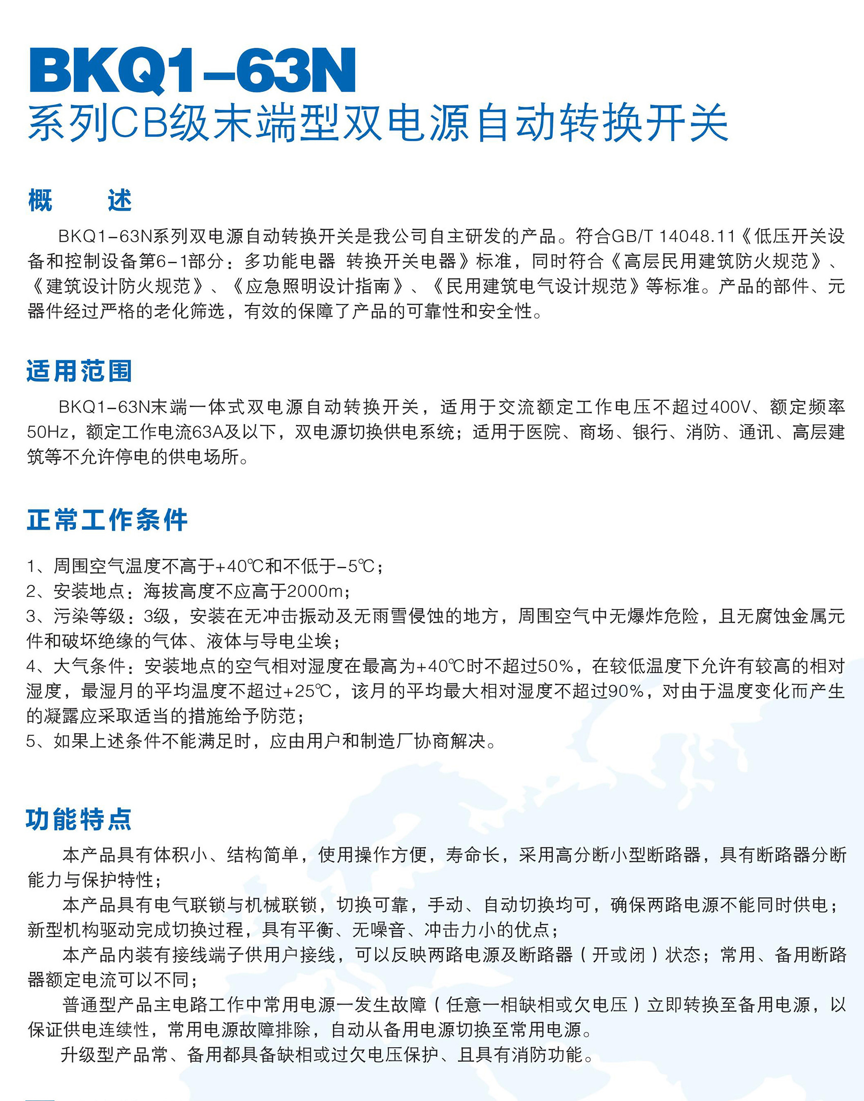 BKQ1-63N末端一體式雙電源自動轉(zhuǎn)換開關(guān),適用于交流額定工作電壓400V及以下、額定頻率50Hz,額定工作電流63A及以下的雙電源切換供電系統(tǒng);產(chǎn)品具有電氣聯(lián)鎖與機械聯(lián)鎖,確保兩路電源不能同時供電;切換可靠,手動、自動切換均可;新型機構(gòu)驅(qū)動完成切換過程,具有平衡、無噪音、沖擊力小的優(yōu)點;廣泛適用于醫(yī)院、商場、銀行、消防、通訊、高層建筑等不允許停電的供電場所。產(chǎn)品符合GB/T 14048.11《低壓開關(guān)設(shè)備和控制設(shè)備 第 6-1 部分:多功能電器 轉(zhuǎn)換開關(guān)電器》。