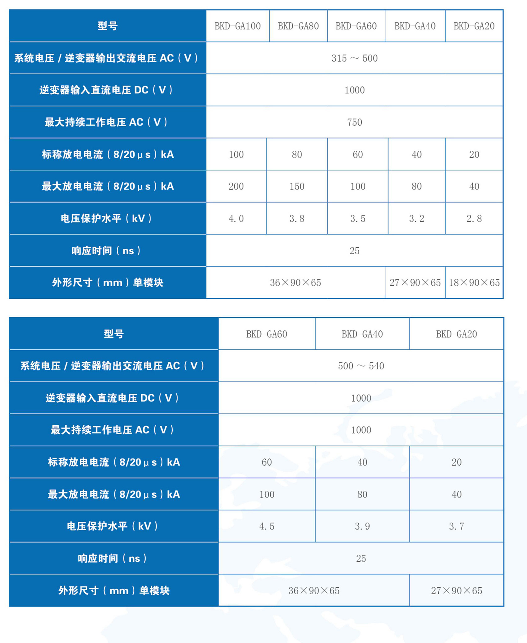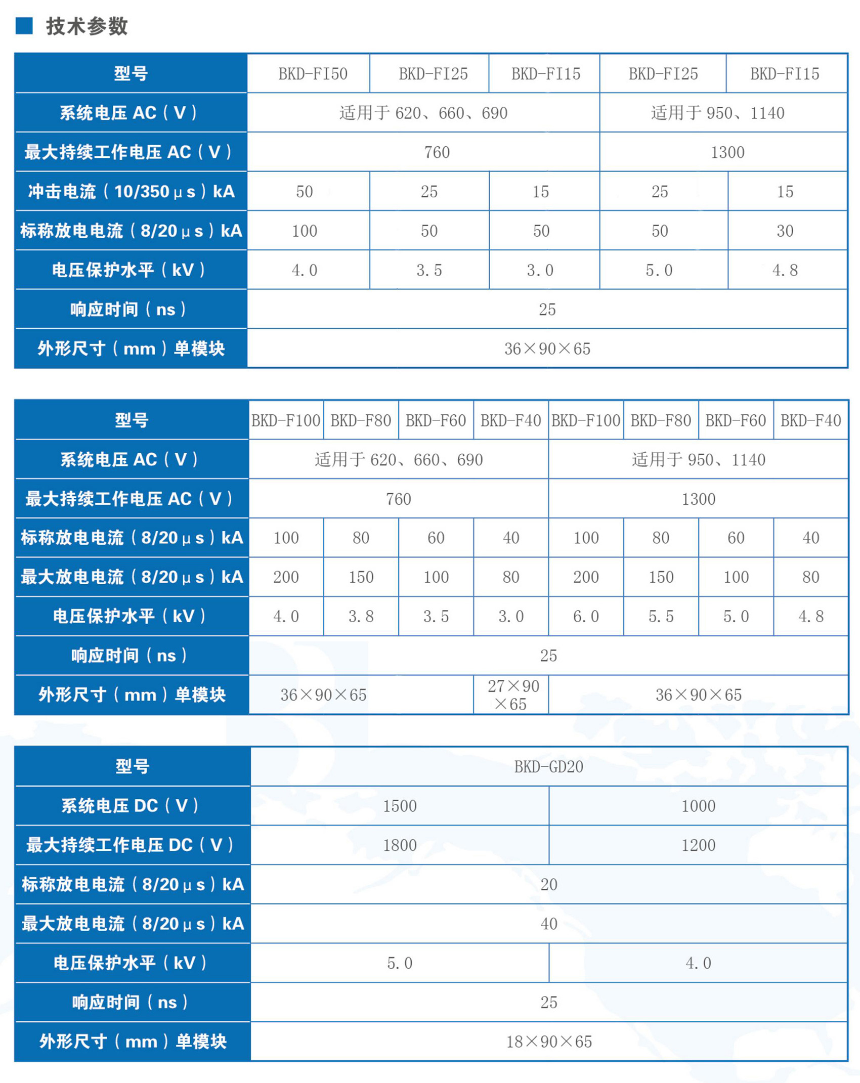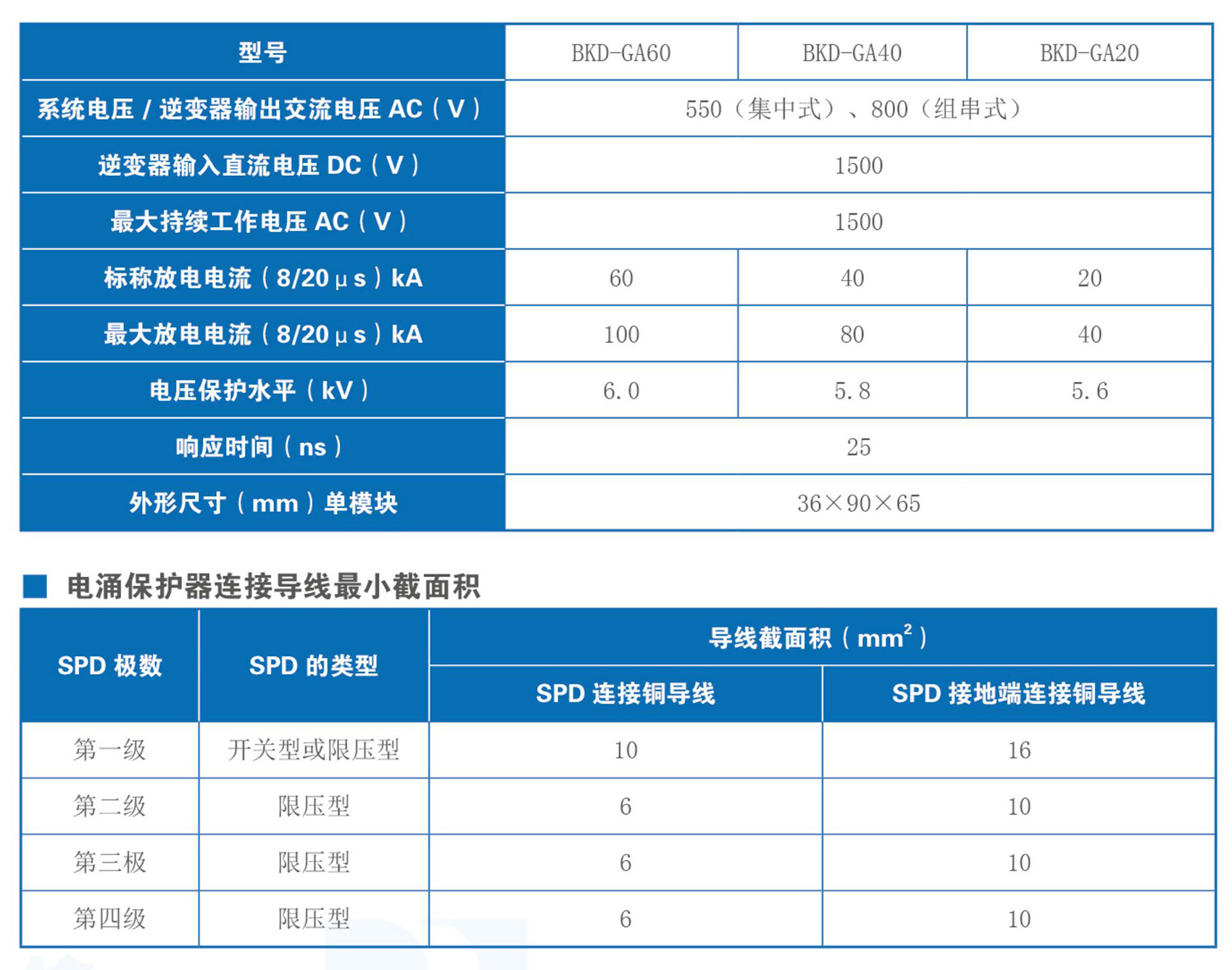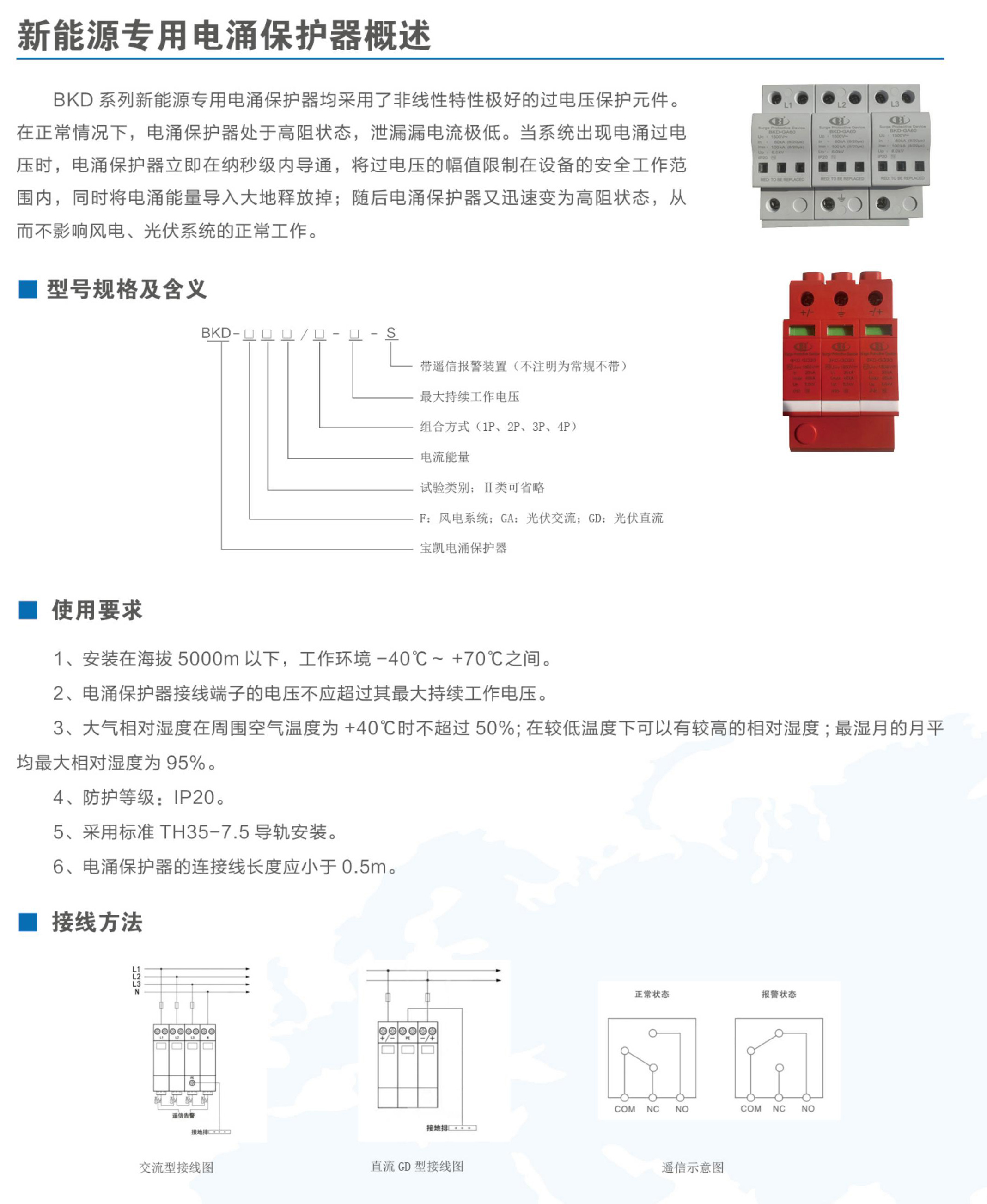 BKD系列新能源專用電涌保護(hù)器均采用了非線性特性極好的過(guò)電壓保護(hù)元件。在正常情況下,電涌保護(hù)器處于高阻狀態(tài),泄漏漏電流極低。當(dāng)系統(tǒng)出現(xiàn)電涌過(guò)電壓時(shí),電涌保護(hù)器立即在納秒級(jí)內(nèi)導(dǎo)通,將過(guò)電壓的幅值限制在設(shè)備的安全工作范圍內(nèi),同時(shí)將電涌能量導(dǎo)入大地釋放掉;隨后電涌保護(hù)器又迅速變?yōu)楦咦锠顟B(tài),從而不影響風(fēng)電、光伏系統(tǒng)的正常工作。產(chǎn)品符合GB/T 18802.11、GB/T 18802.11標(biāo)準(zhǔn)。
