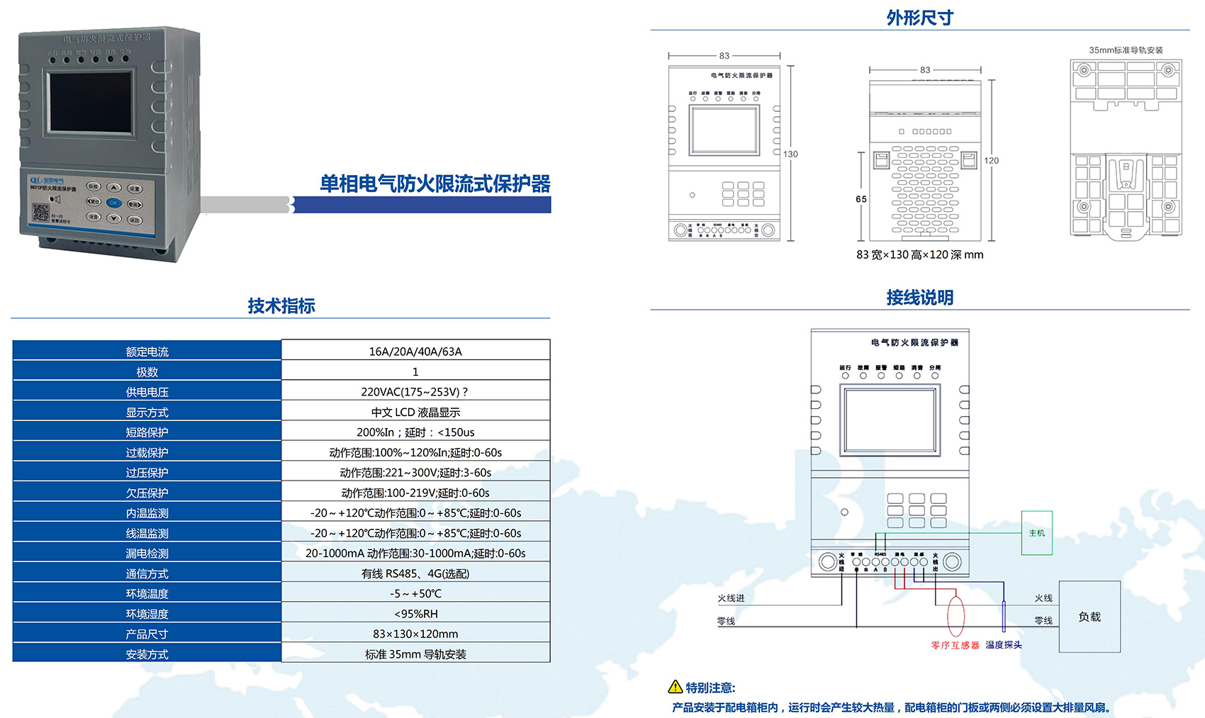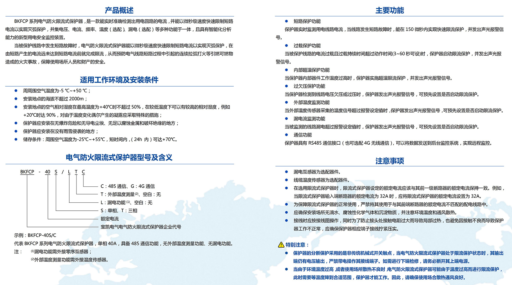 BKFCP系列電氣防火限流式保護(hù)器,是一款能實(shí)時(shí)準(zhǔn)確檢測出用電回路的電流,并能以微秒級(jí)速度快速限制短路電流以實(shí)現(xiàn)滅弧保護(hù),并集電壓、電流、頻率、溫度(選配)、漏電(選配)等多種功能于一體,且具有智能化分析能力的新型用電安全監(jiān)控裝置。當(dāng)被保護(hù)線路中發(fā)生短路故障時(shí),電氣防火限流式保護(hù)器能以微秒級(jí)速度快速限制短路電流以實(shí)現(xiàn)滅弧保護(hù),在由短路產(chǎn)生的電流遠(yuǎn)未達(dá)到短路電流前就完成限流,從而預(yù)防電氣線路短路過程中引起的連續(xù)拉弧打火等引燃可燃物造成的火災(zāi)事故,保障使用場所人員和財(cái)產(chǎn)的安全。